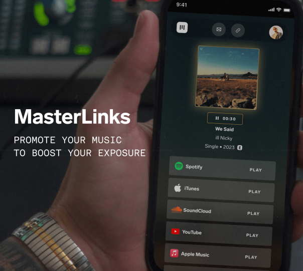 MasterLinks send fans to pre-save your song or album on Spotify and Apple Music before your release date. Once your release is live, your MasterLink becomes a hub where fans can click to stream on their go-to platform.